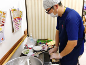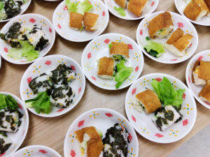 さて、今回のお寿司は少し特別な工夫をしています。誤嚥(ごえん)のリスクを考慮し、大きな海苔を使う代わりに、いなり寿司の皮を使用しました。海苔も細かくちぎってまぶすことで、風味豊かな仕上がりに。皆様が安心してお召し上がりいただけるように、食べやすい大きさに切って盛り付けをしていきます。