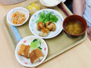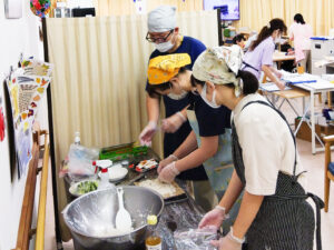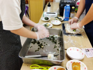 今回は、巻き寿司作りのベテランであるご利用者様有志の皆様にもお手伝いをお願いしました! 皆様、お好きな具材を選ばれ、巻きすに手をかけ、「よいしょ、よいしょ」と手際よく巻いてくださいましたよ。