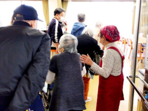 すっかり恒例となりました地域のボランティアグループ「つばさ」様による、月に一度の喫茶ボランティア。 おいしいお茶とお菓子、そして様々な趣向を凝らしたプレゼントにふれあいの丘のご利用者様は毎回心待ちにされています。開始前からご利用者様が列を作り、今か今かとお待ちになっている様子が盛況ぶりを物語ります。