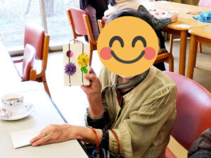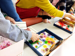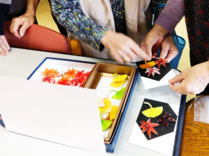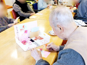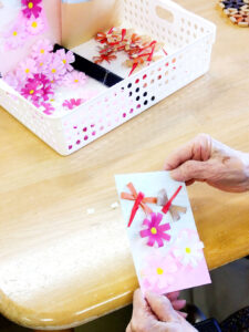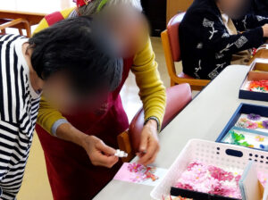 普段こういったものづくり系のレクリエーションの機会が少ない養護老人ホームやショートステイのご利用者様も「つばさ」の皆様の手ほどきを受けて、思い思いにパーツを並べます。自分だけの特別な絵はがきを作る楽しさに触れられている様子でした。