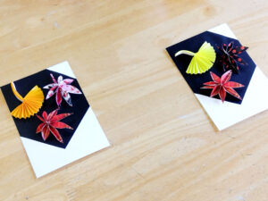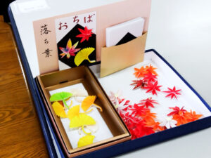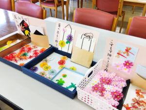 そして、今回ご用意いただいたプレゼントは、ご利用者様ご自身で制作される「絵はがき」です。 コスモス畑、菊、落ち葉といった秋にちなんだテーマで、折り紙でご用意いただいたお花などのパーツを、はがきの好きな場所に組み合わせていただきます。