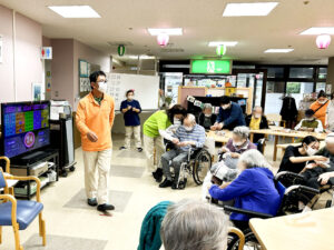 このタイミングで、なんと1階と2階から同時にビンゴの声が上がりました! 養護老人ホームのご利用者様とデイサービスのご利用者様の一騎打ち。運命のラストワンをかけて、リモートじゃんけんで決着をつけることに!