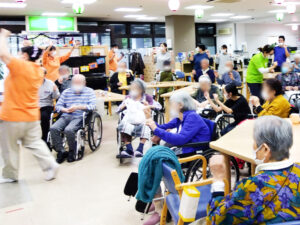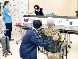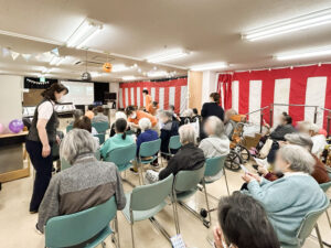 ビンゴゲームが初めてのご利用者様も少なくない中、職員が丁寧にゲームの方法を説明し、聞き逃しがないよう番号を連呼。ご利用者様のカードを一緒にチェックしていきます。