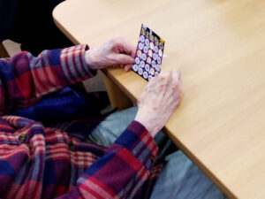 職員も皆様のカードを丁寧にお手伝い。お一人おひとりのペースに寄り添いながら、「〇〇さん、あと一つでリーチですよ!」と一緒に一喜一憂する時間が流れます。
