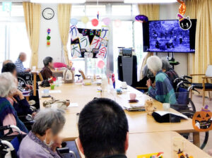 今月は、9月の巻き寿司レクに引き続き、ショートステイでは初の試みとなるカラオケ大会を開催しました! いつも体操や歌レクなどに使用しているテレビ画面をカラオケ機器に繋ぎ、さあ、歌のスタートです🎵