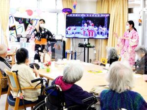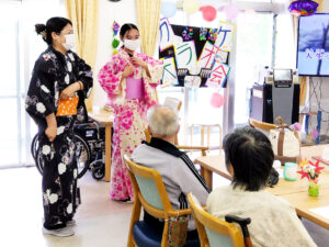 いつの間にか浴衣に着替えた職員が登場し、賑やかに「炭坑節」を披露! 歌と共に、画面に合わせて皆様思い思いに振り付けを踊る姿も見られました。初めての方には少し難しい炭坑節ですが、皆様一生懸命に挑戦されていましたよ✨