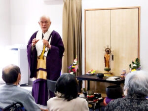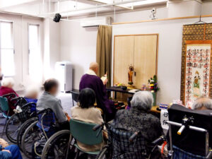 当施設で逝去された方々のご冥福を祈り、そして現在お過ごしのご利用者様と職員の健康を祈念して、厳かに般若心経が唱えられました。 静かに目を閉じて聞き入る方、仏壇を見つめ深く合掌される方……。皆様それぞれが、新年の祈りを捧げる大切な時間を過ごされていました。