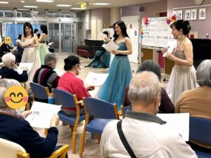 今回は多彩な楽曲を楽しめるメドレーと、ご利用者様も一緒に口ずさめる合唱コーナーを織り交ぜた豪華なプログラム。初めて聴くプロの声楽に、皆様興味津々のご様子です。