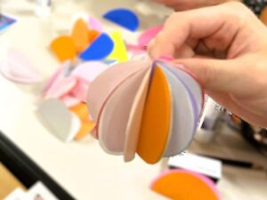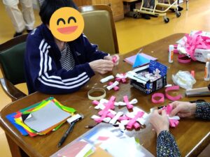作っていたのは、春らしいピンクと白の紙テープを使ったお花。 見本と見比べながら、「こっちの方が可愛いかも?」「このまま進めよか~」と、各々アイデアを出し合いながらワイワイと制作に励まれていました。こうした試行錯誤の時間も、大切な交流のひとときですね。