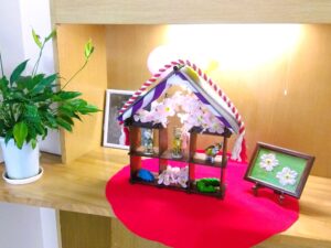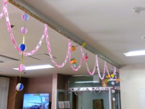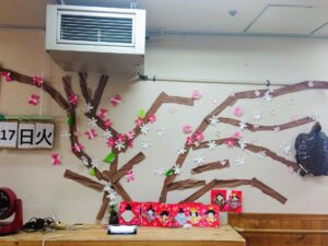 そしてついに、娯楽コーナーの壁に見事な桜が満開になりました! ゆらゆら揺れるぼんぼりも添えられて、ホールはすっかりお花見気分です☺