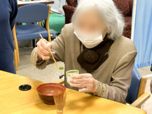 点てたお茶を召し上がりながら、「ちょっと抹茶入れすぎたわ~(笑)」 「お茶菓子はないの?(笑)」 と冗談を交えながらリラックスして歓談される皆様。和やかで笑いの絶えない時間を楽しまれている姿を拝見し、職員一同もとても嬉しい気持ちになりました。