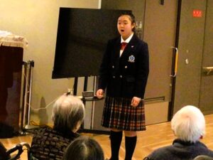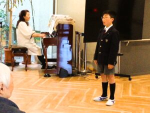 今回お迎えしたのは、今年の「全日本ジュニアクラシック音楽コンクール」にも出場する実力派の3人。中学1年生が1名、小学6年生が2名という若さですが、ひとたび歌い始めると年齢を感じさせない堂々としたパフォーマンスに圧倒されます。時折見せる子供らしいあどけなさと大人顔負けの歌唱力のギャップに、ご利用者様も驚きつつ、その清らかな声に深く聴き入っておられました。
